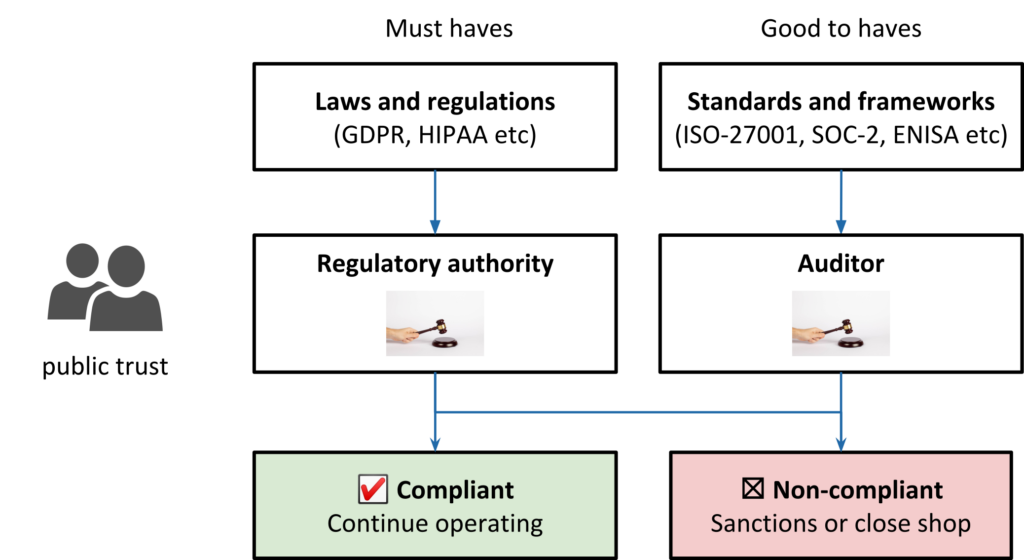 Companies in certain sectors, such as BioTech, FinTech, MedTech, and those processing personal data, need public trust to operate. Such companies are allowed to handle sensitive data, create and destroy money, etc., in exchange for being compliant with certain regulations — in devtalk put, sticking to some rules set by regulators. For example, any bank operating in Sweden is regulated by Finansinspectionen (the Swedish Financial Authority) and has to comply with FFFS. Similarly, any company dealing with personal data is scrutinized by Datainspectionen (the Swedish Data Protection Authority) and needs to comply with GDPR. Such regulation is not only aspirational, but is actually checked as often as yearly by an external auditor. If the company is found to be non-compliant they might be forced to close shop and devs will have to brush up their LinkedIn profile.