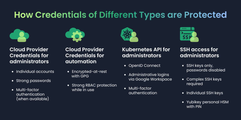 The Kubernetes platforms need access to the underlying cloud infrastructure for automation purposes: to request block storage, to start and stop servers, and such. For this, the credentials it gets to use are at rest, stored encrypted in git repositories in such a way that only our specifically authorized personnel (the platform administrators) can read them, using SOPS encryption with personal GPG keys. For live automation use, the credentials are stored in Kubernetes Secrets, because this is what the Kubernetes cloud controller managers depend on. These are protected from even our customers via strong Kubernetes RBAC protection. We go to the utmost level to protect these, which is one of the reasons why we are strict about maintaining a clear divide between what access our customers can have. We also take proactive measures to ensure that no information can be disclosed via e.g. misconfigured privileged components in the platform (such as mitigating the NGINX Ingress Controller bugs that scared the community a while ago).